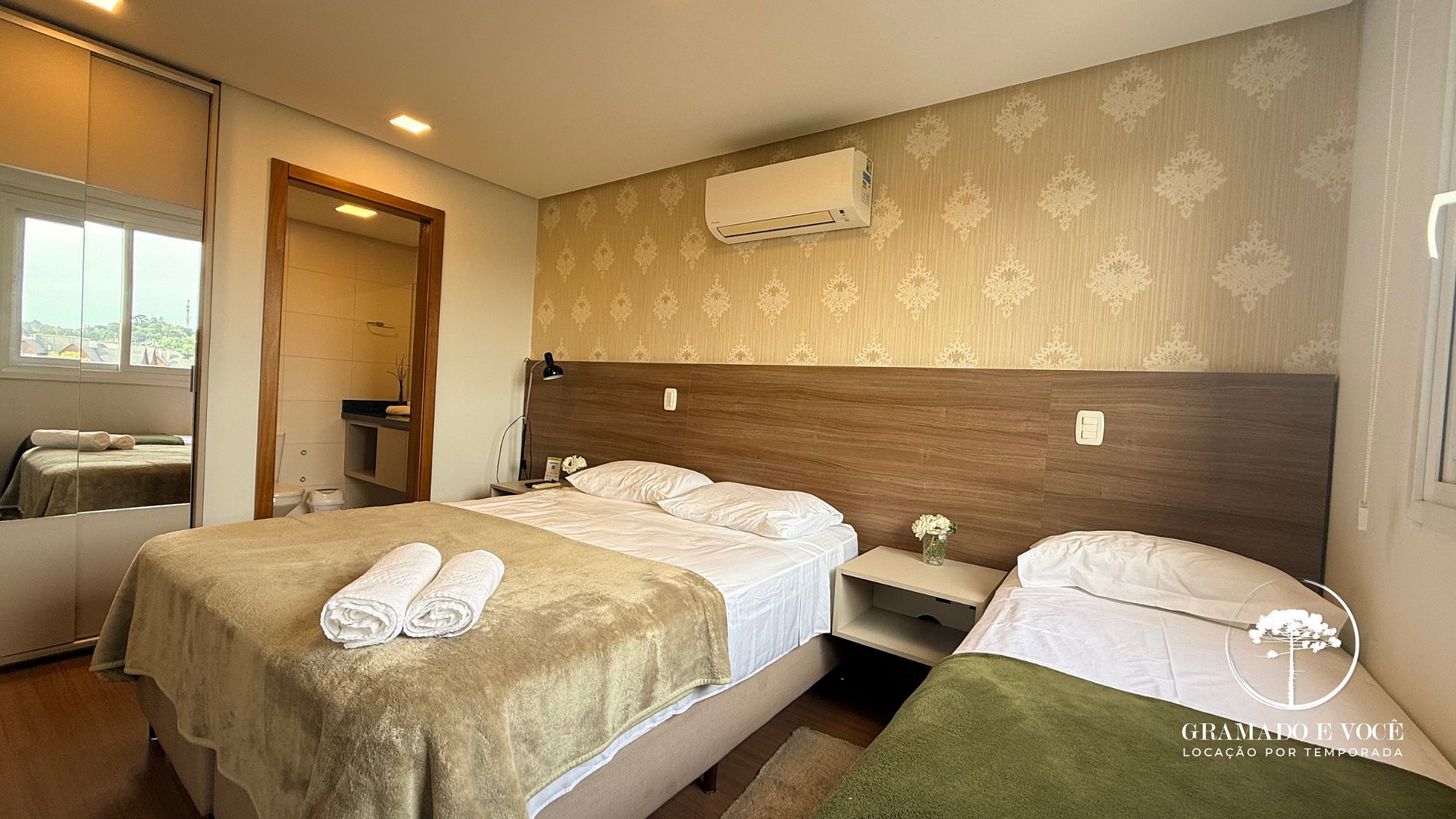 1 suite con cama queen, cama individual, aire acondicionado, TV y baño privado;