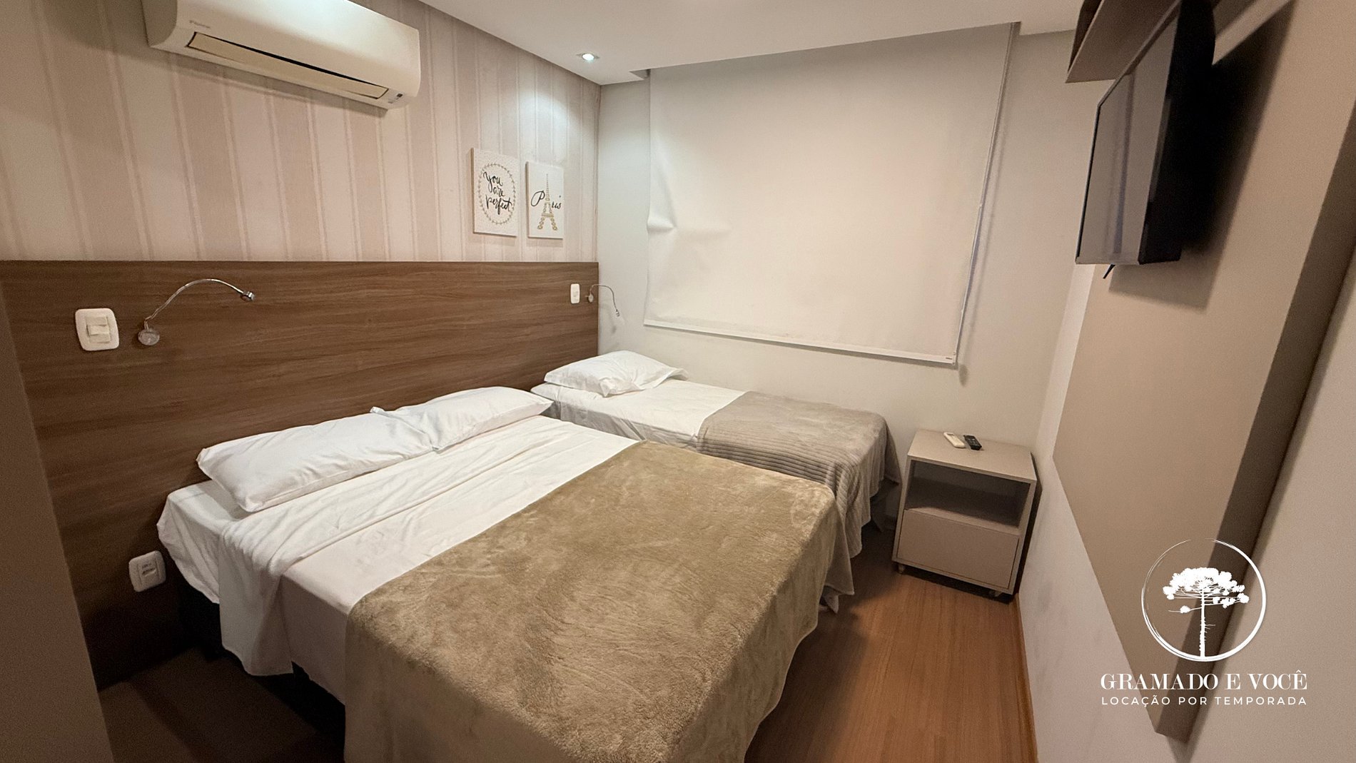1 habitación con una cama doble y una individual, aire acondicionado y TV;