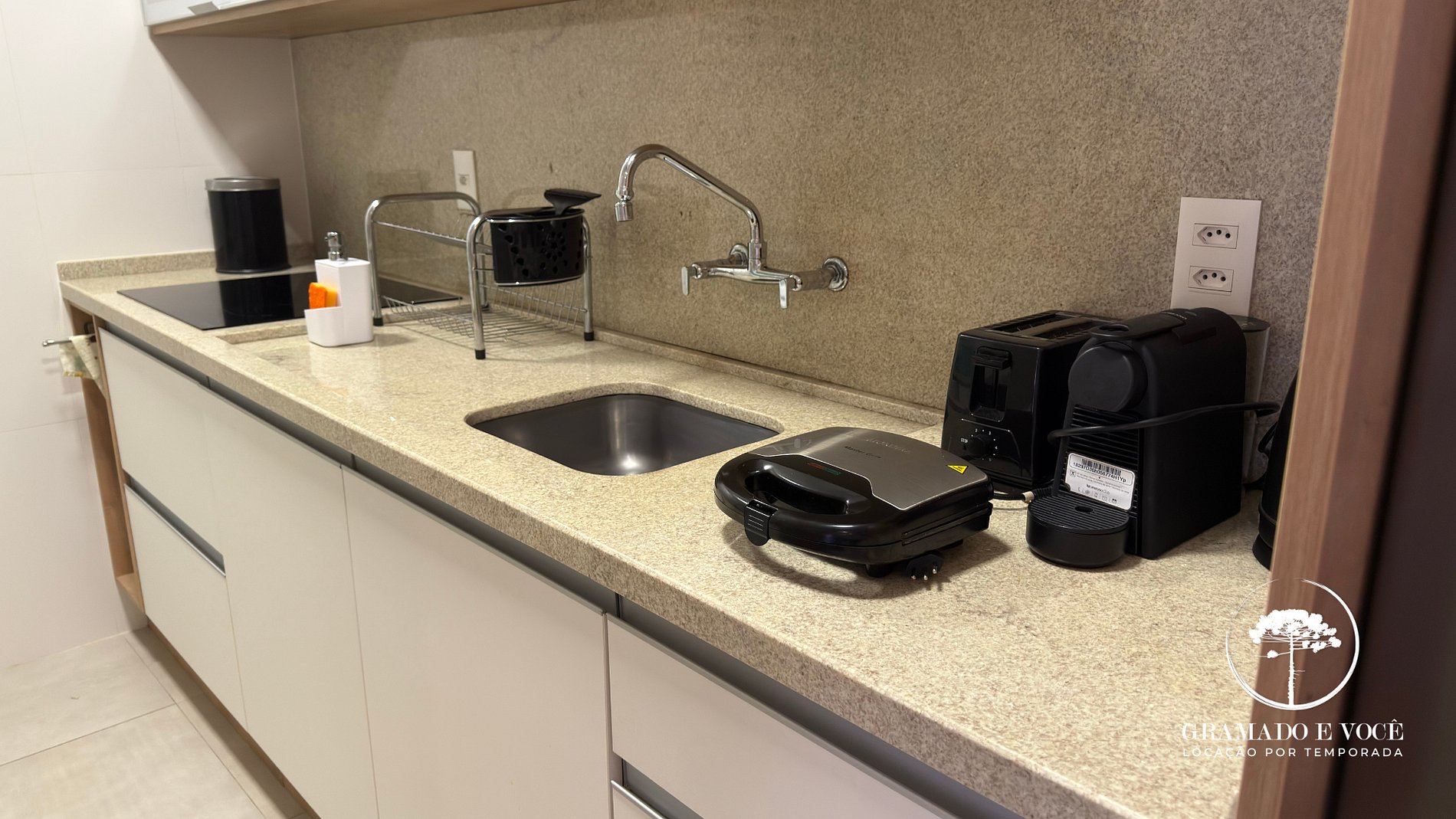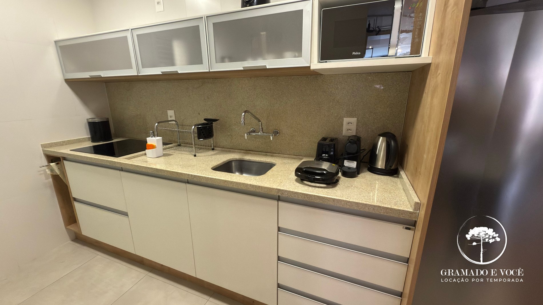 Cozinha equipada com forno elétrico, micro-ondas, cafeteira, jarra elétrica, louças, panelas e utensílios;
